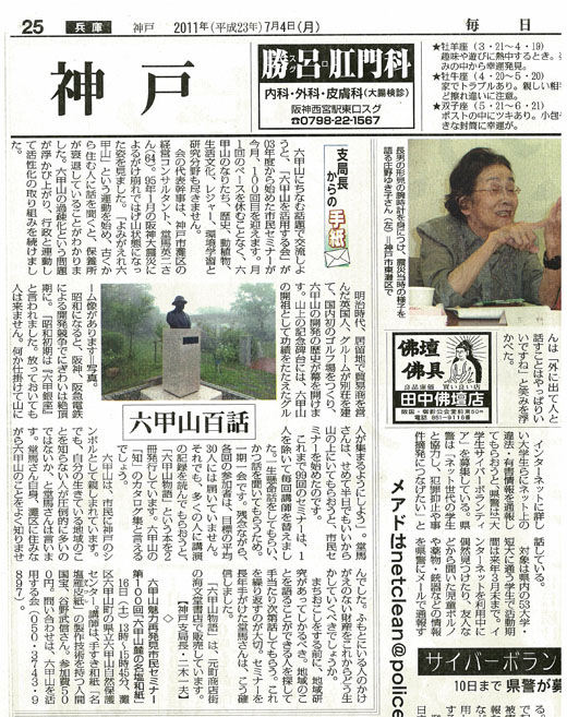 毎日新聞の「支局長からの手紙」で「市民セミナー」と「六甲山を活用する会」が紹介されました